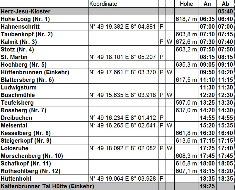 Ich habe hier noch einen Zeitplan von den Geocachern für die Strecke angehängt. Beachtet bitte, dass der Start für die Letterbox nicht am Herz-Jesu Kloster erfolgt und die Wegführung ab Hüttenhohl sich deutlich unterscheidet.