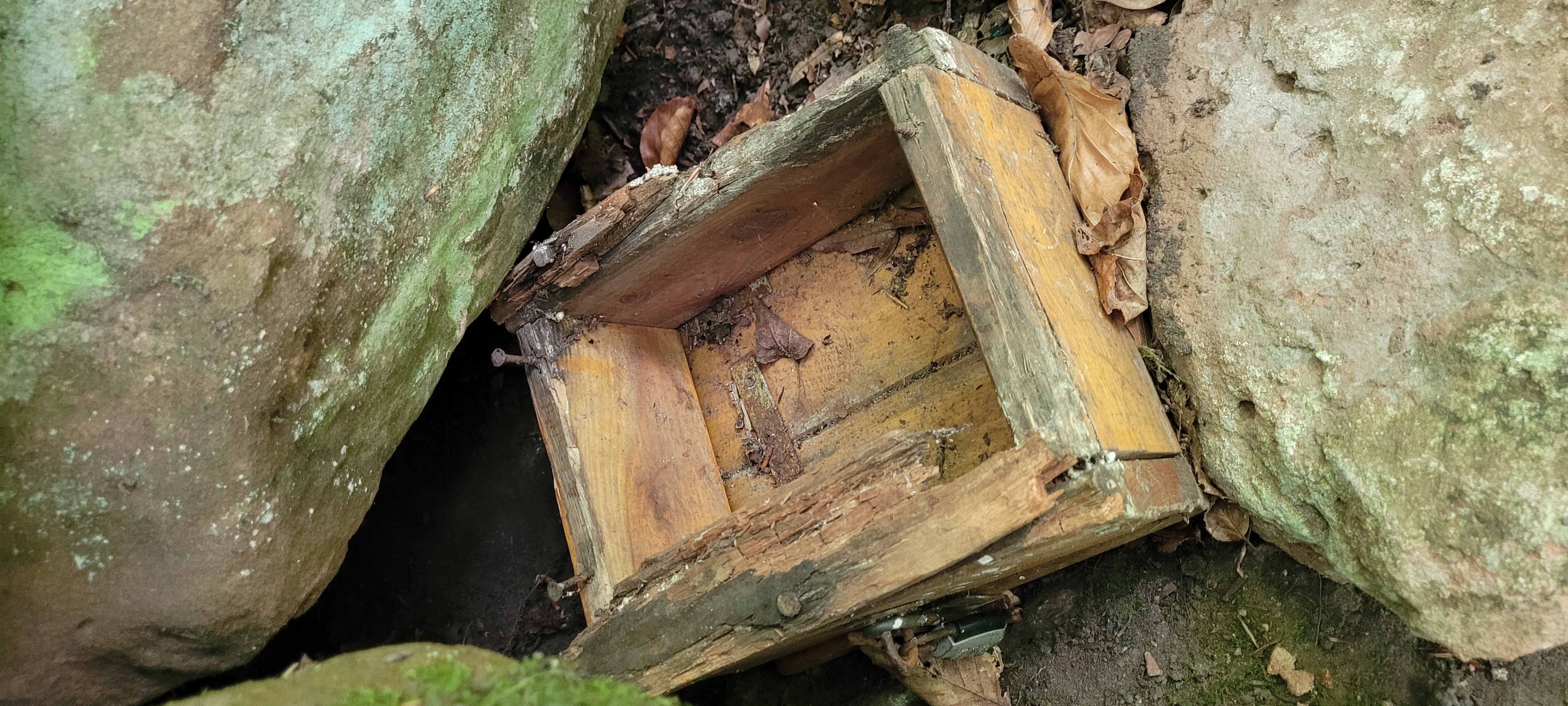 Wir kamen heute in der Nähe vorbei. Da Birgit den Stempel noch nicht hat, wollten wir der Box einen kleinen Besuch abstatten. Wir fanden auch eine halbe Holzkiste im getarnten Versteck - die war aber leer und es war auch weit und breit kein Logbuch oder Stempel zu sehen.