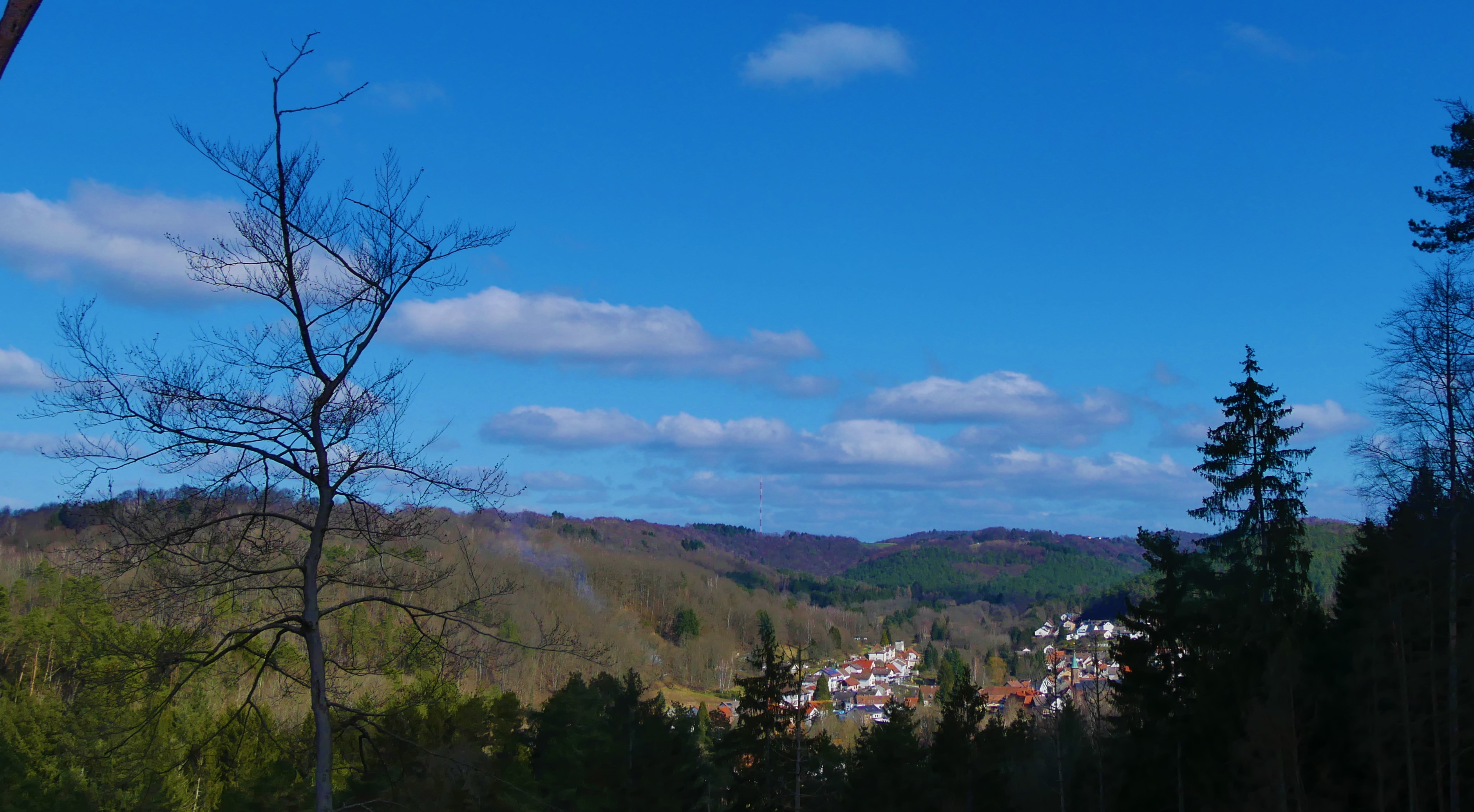 und wir wurden mit einem perfekten Ostermontag-Wetter mit strahlendem Sonnenschein und blauem Himmel am Startpunkt empfangen. Wir genossen schon die schöne Parkatmosphäre zu Beginn der Box und machten uns, halb in französischer Begleitung zum Aufstieg. Am 1. Aussichtsfelsen der Box bewunderten wir die Aussicht auf das Dörfchen